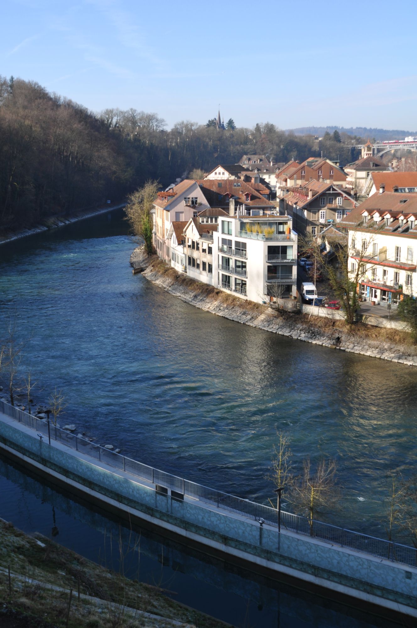 虽然是瑞士的首都,但伯尔尼却是一座座落在莱茵河支流阿勒河畔的一个袖珍城市。湍急的河水从三面环绕伯尔尼老城而过,淙淙流水绿树掩映,就如同一幅幅风景画非常美丽。圆石铺就的光亮街道,街道两旁彼此相连的拱廊,红瓦白墙相映生辉的古老房屋,各有典故的街心彩柱喷泉,始建于1421年的哥特式大教堂,都使伯尔尼老城显得古香古色,充满中世纪的神秘色彩。